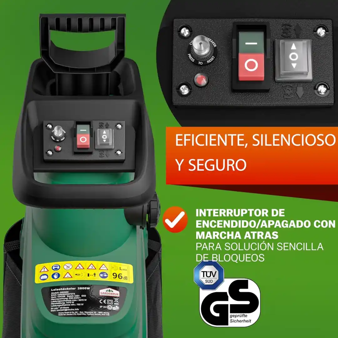 Biotrituradora eléctrica de rodillo con potencia nominal 2800W (máxima 3100W), sistema silencioso a 54 rpm, tritura ramas hasta 44 mm. Incluye 2 bolsas de recolección de 60L, marcha atrás, ruedas y certificación TÜV SÜD GS. Peso: 17 kg. Ideal para jardines medianos y compostaje doméstico.